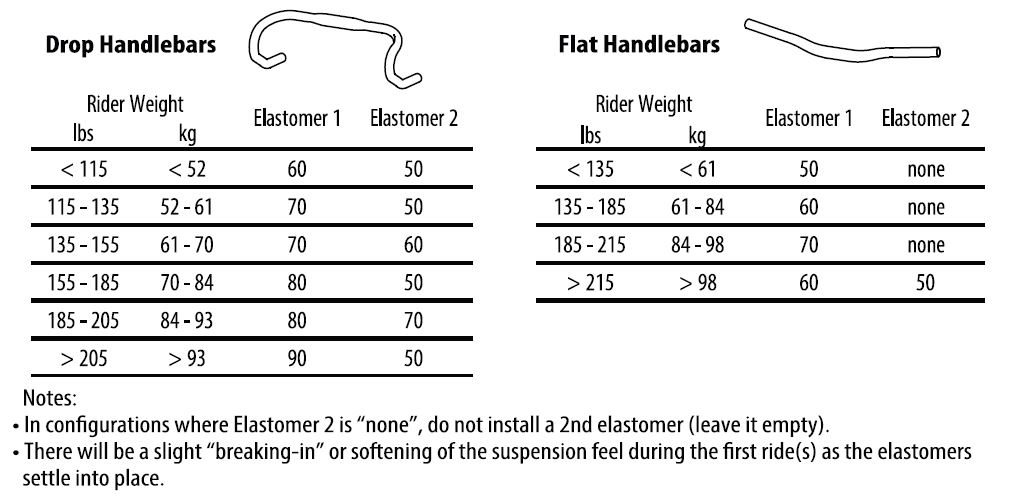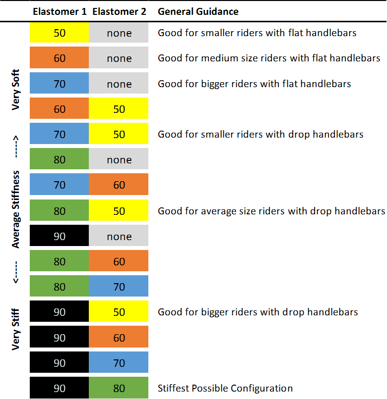 The ShockStop comes with 5 different elastomers to choose from so everyone can dial in the perfect feel. Below is our recommended chart from the instructions that provides a good starting point when first setting up the stem: